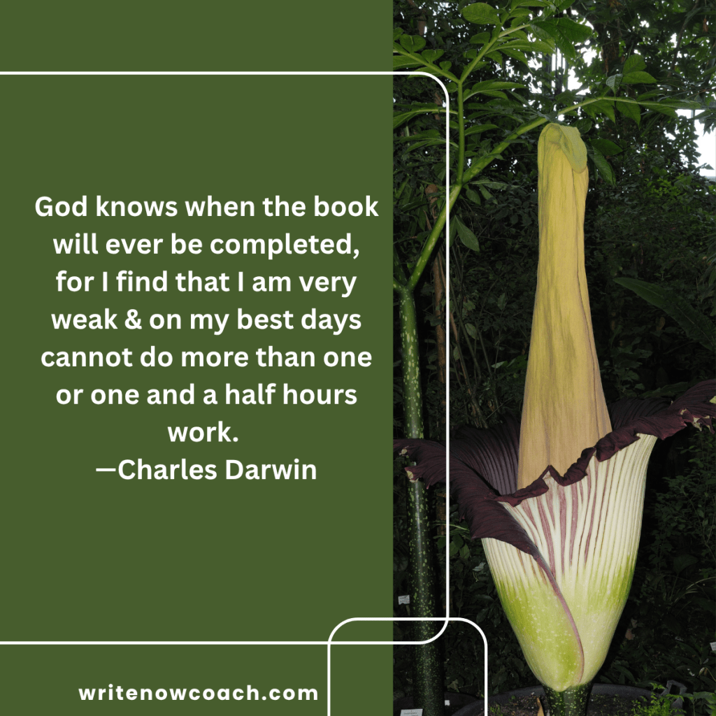 Be persistent and patient. Charles Darwin was known for quoting Anthony Trollope’s phrase, “It’s dogged as does it.” You may have days where you feel sick (as Darwin did) and cannot work, or you may have days and weeks when the distractions of politics are just too much. Be patient with yourself. Take the day off and get back to it tomorrow.